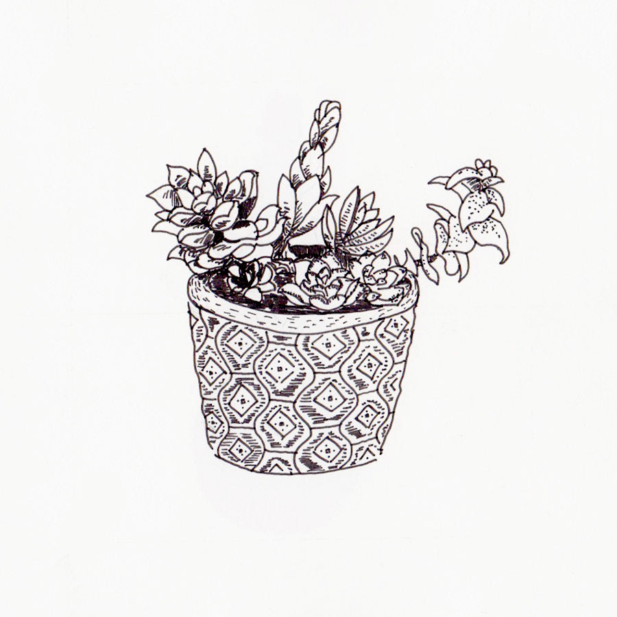 Pencil, Ink and Marker illustrations of various succulents.